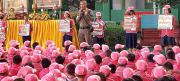 คุณครูพร้อมนักเรียนโรงเรียนฝวาหมินกงลิ ชุมพร นำโดยดร.มยุรี ทิพย์ญาณ ผู้อำนวยการโรงเรียนฝวาหมินกงลิ ในอำเภอเมือง จังหวัดชุมพร ร้องเพลงในงานม่านน้ำแห่งพระบารมี