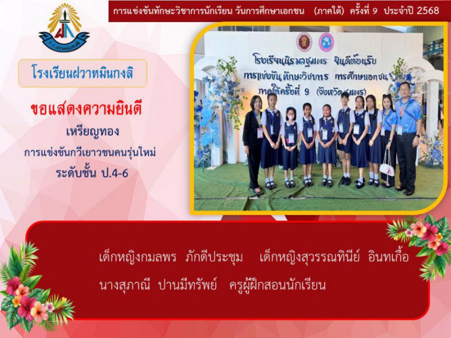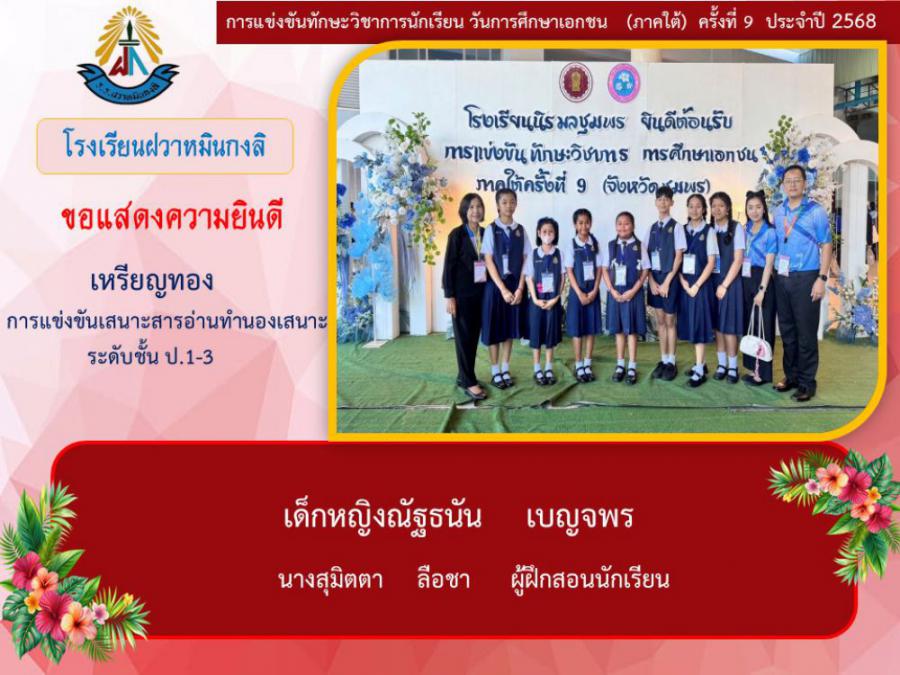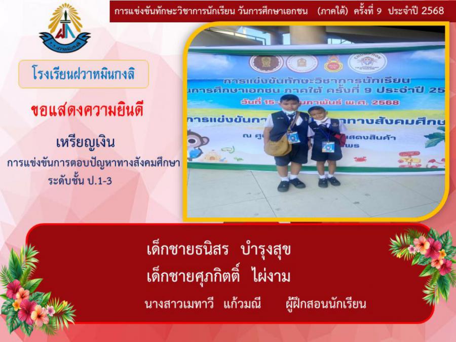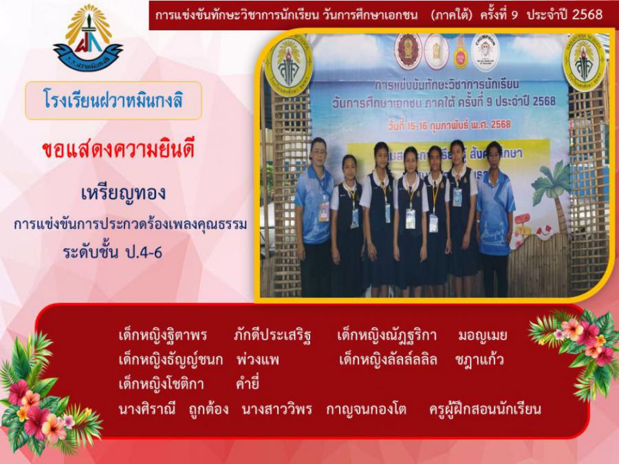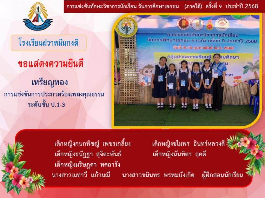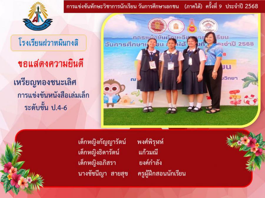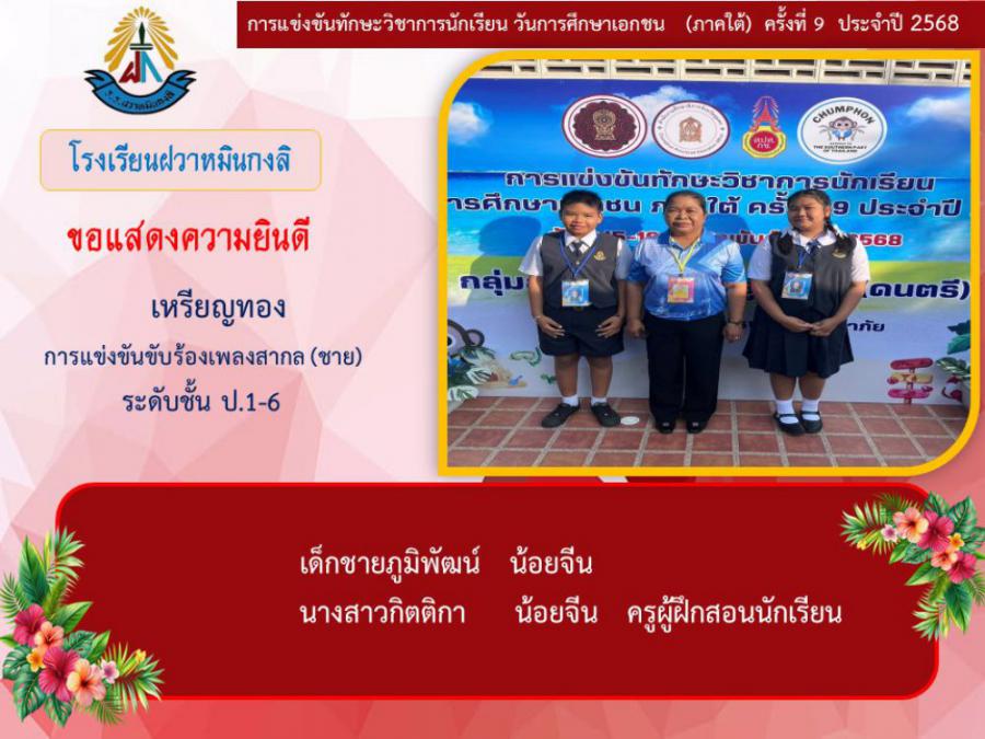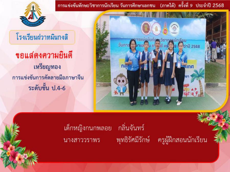 ขอแสดงความยินดีกับนักเรียนและคุณครูผู้ฝึกซ้อม คณะครู ผู้ปกครอง นักเรียนโรงเรียนฝวาหมินกงลิ เนื่องในการเข้าร่วมการแข่งขันทักษะวิชาการ วันการศึกษาเอกชนภาคใต้ ครั้งที่ ๙ ประจำปี ๒๕๖๘